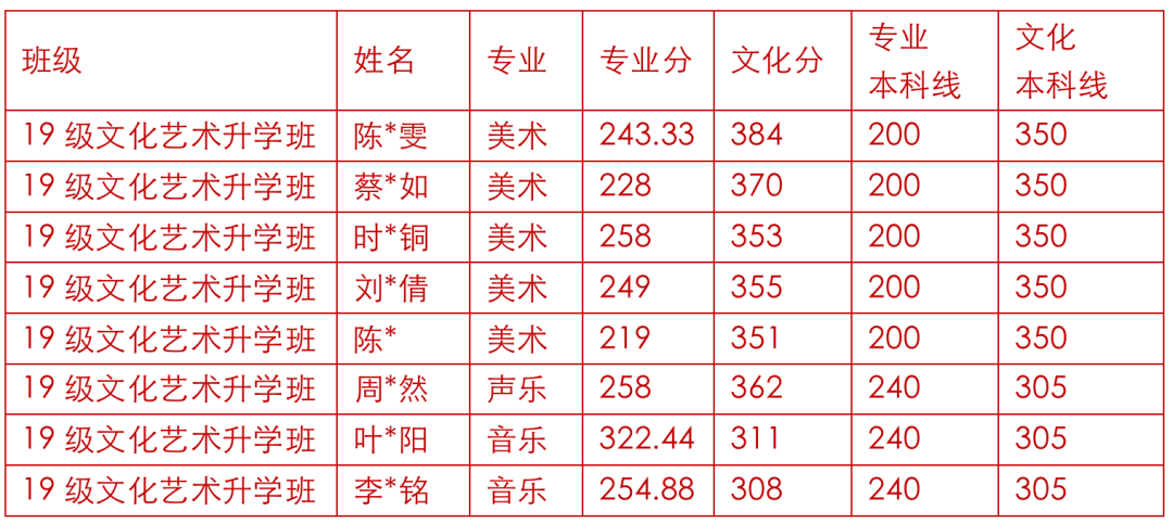 2019级文化艺术升学班,作为学校首届普高类升学班,2022年高考旗开得胜,有8名学子文化和艺术双上线,多名同学有望考入211等综合本科大学艺术类专业。