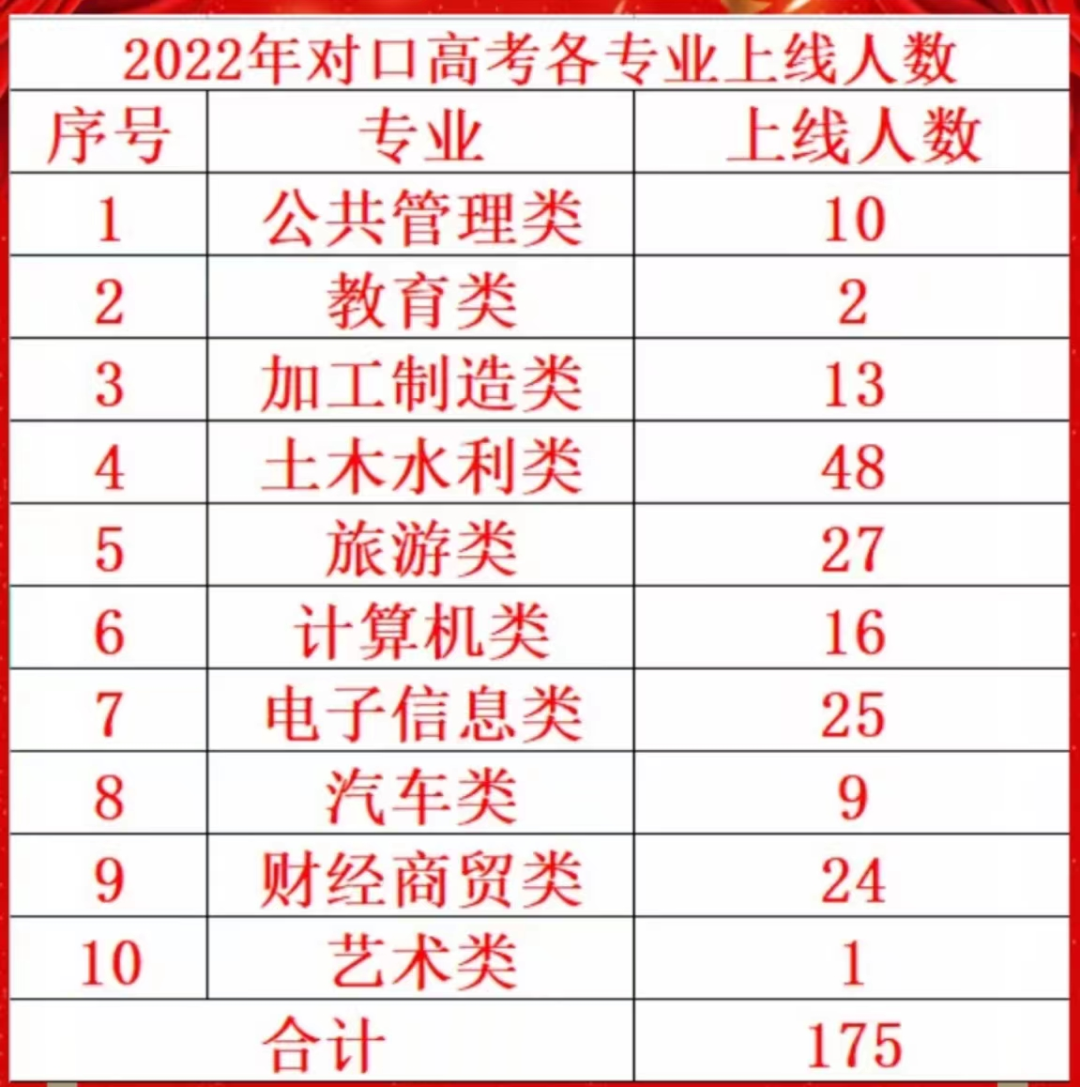 2022年参加全省对口高考一次性本科上线175人,位居全省第四、全市第一。