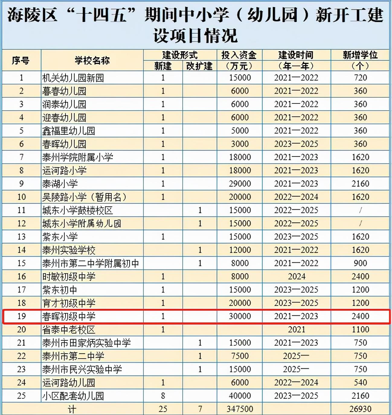 此外,从海陵区“十四五”期间中小学(幼儿园)新开工建设项目情况来看,泰州市春晖初中的投入资金约30000万元,建设时间在2021-2023年,新增学位2400个。