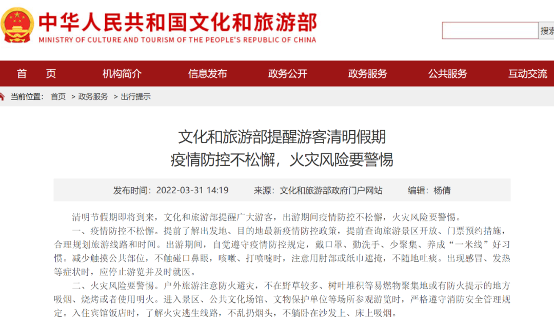 3月31日,文化和旅游发布“提醒游客清明假期疫情防控不松懈,火灾风险要警惕”的相关通告: