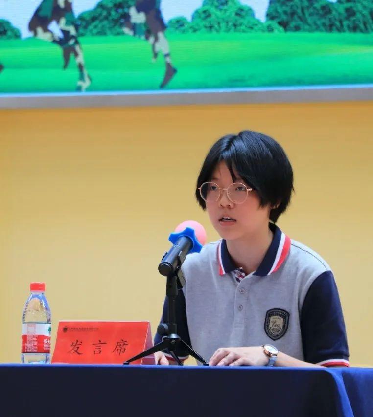 第一中队莫可同学作为军训学员代表,号召同学们积极参训、服从指挥、坚强勇敢,珍惜军训的每一天。