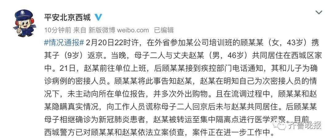 顾某某将此事告知赵某,赵某在明知自己为次密接人员的情况下,未主动向所在单位报告,并多次外出购物。且在流调过程中,顾某某和赵某隐瞒真实情况,向工作人员谎称母子二人回京后未与赵某共同居住。后顾某某母子相继确诊为新冠肺炎患者,赵某被转运至集中隔离点进行医学观察。目前,西城警方已对顾某某和赵某依法立案侦查,案件正在进一步工作中。