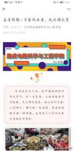 学院开展“团圆·春节·美食”“文化·春节·祝福”“嗨,津天理好”等活动,推出 “青听·听妈妈的话”“妈妈的味道就是年,我想对妈妈说”“家乡的年味”“春节摄影大赛”等栏目。