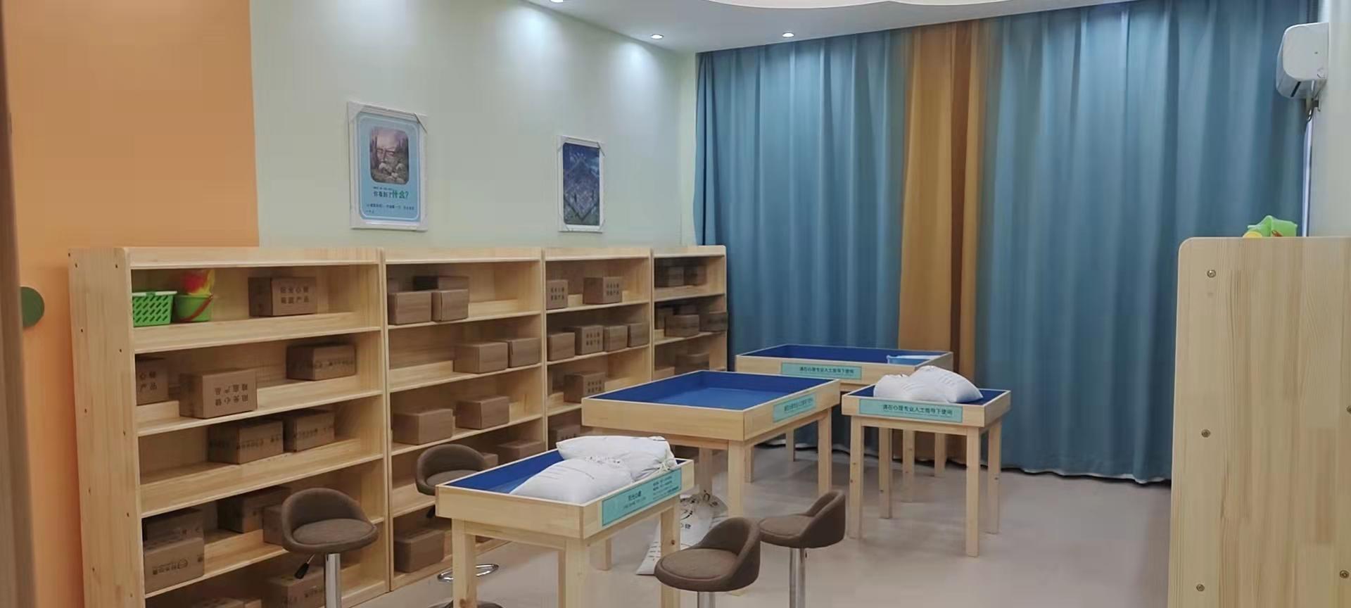 心理沙盘室作为最主要的功能室之一。沙盘游戏又称作箱庭疗法,对于特殊儿童的治疗有着非常大的意义。比如对于自闭儿童的心理治疗作用,它提供了一个“自由与受保护”的空间,在这里孩子通过象征、隐喻的形式不仅可以再现出与创伤经历相关的情景以帮助发现问题,同时也可以宣泄出与创伤经历相关的复杂情感从而达到治疗的目。而且对于儿童智力的开发,健全的人格建设,想象力的提升以及自我管理能力等都有很大的帮助。