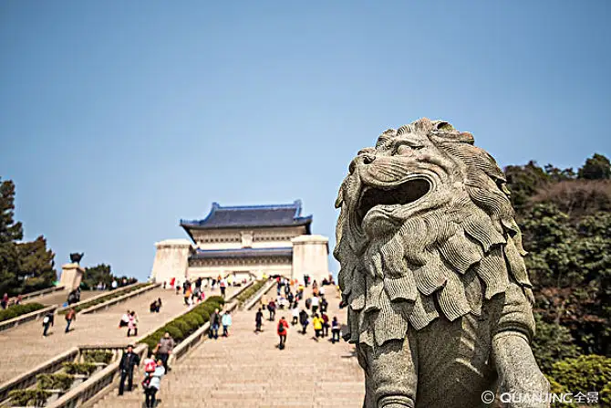 中山陵精巧的设计包蕴了许多寓意,譬如,392级石阶象征了全国39200万人,从下往上看是只见台阶不见平台,寓意革命道路之艰难坎坷,从上往下看只见平台不见台阶,则寓意伟人视野之开阔。