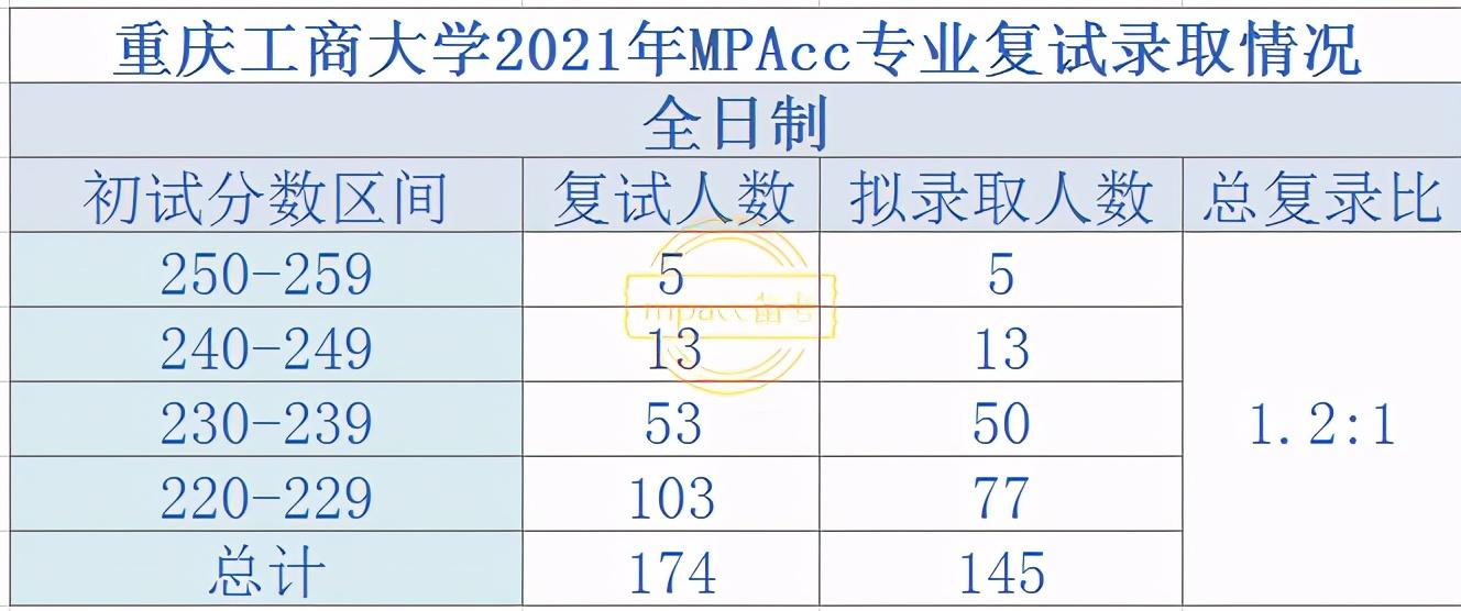 2021年重庆工商大学MPAcc专业计划招收全日制140人,复试分数线为222/92/46,实际进入复试174人,拟录取145人。实际录取人数比计划招生人数多出5人,复试刷人较少,从这个角度来看算是比较好考的院校了。