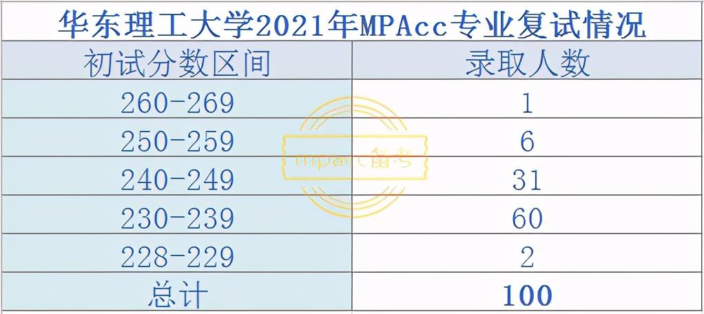 2021年MPAcc专业复试分数线为228/46/92,可见华东理工大学的分数线并不低,在今年全日制拟录取的100人中,初试最低分为228分。