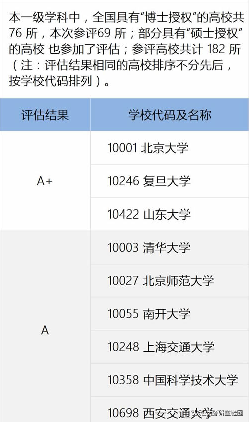 获得评估结果A+的高校有3所,主要是北京大学、复旦大学和和山东大学。获得A类学科的高校主要有清华大学、北京师范大学、南开大学、上海交通大学、中国科学技术大学、西安交通大学。