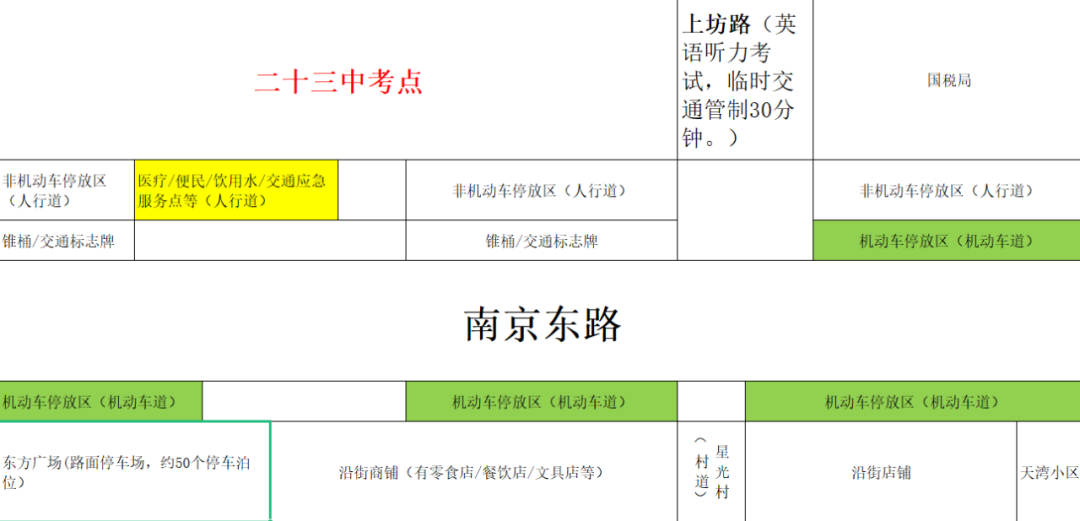 3、考点周边停车:二十三中考点门前两侧严禁停车,送考生车辆可在南京东路即停即走。放下考生后有停放需求的可以停放在离考点门前50米处的道路两侧或考点对面停车场。