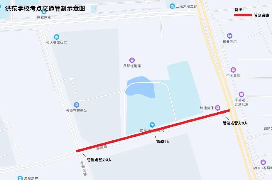 (1)莲塘一中东门临街道路、洪州学校东侧临街道路交通管制地段:南起农科路与澄湖西路交界的红绿灯路口处,北至小蓝北路以南的原小蓝路与澄湖西路路口处。