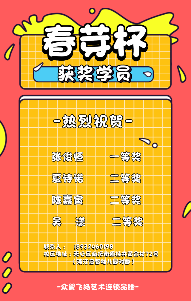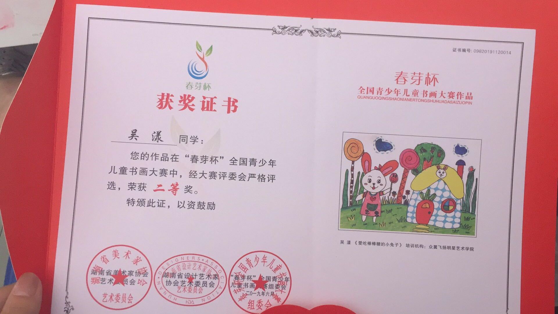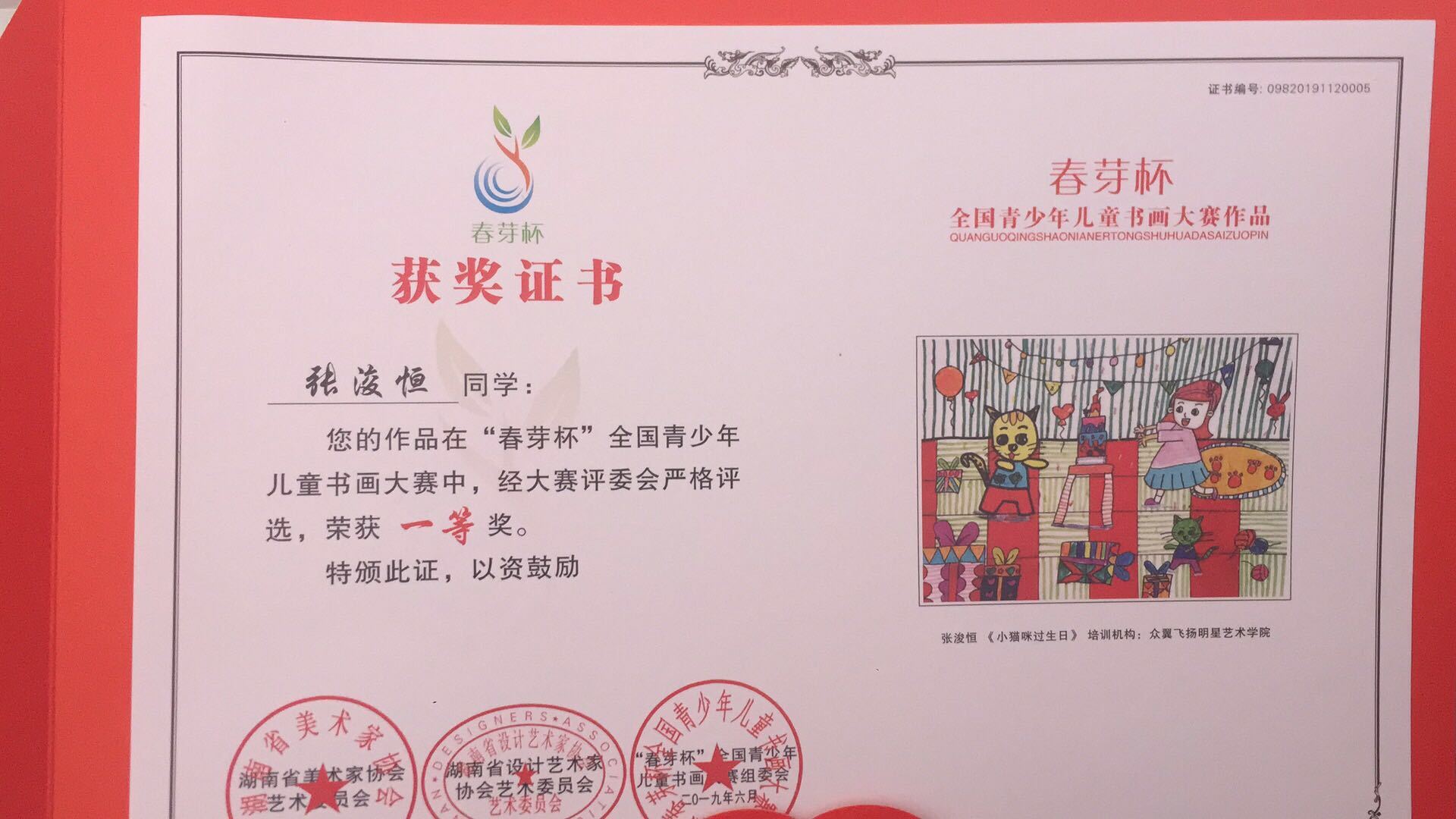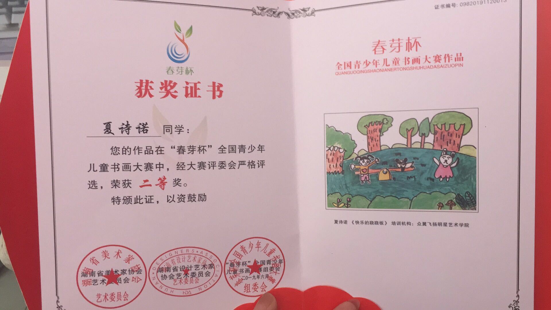 2019“春芽杯”全国青少年儿童书画大赛比赛成绩揭晓,祝贺我校桂井校区美术班学员张俊恒荣获一等奖,夏诗诺、陈嘉寅、吴漾荣获二等奖的好成绩。