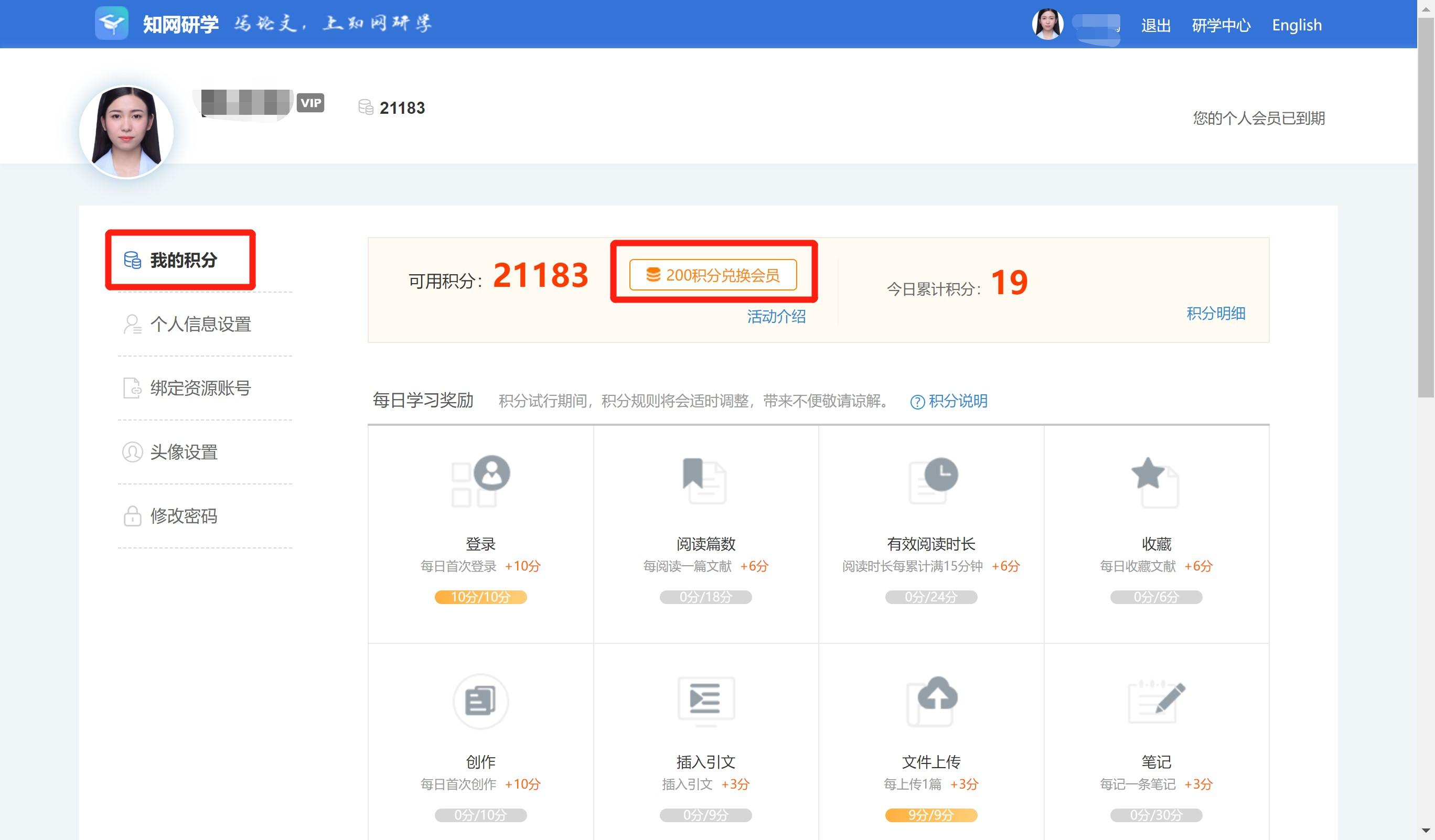 3. 老用户:已经领取过14天会员的用户,可以点击右上角头像,点击“我的积分”,使用积分兑换会员。