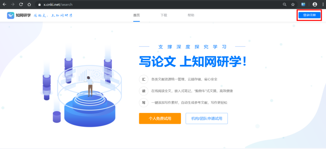 2. 或通过知网研学平台网址 x.cnki.net 直接进入,如下图所示: