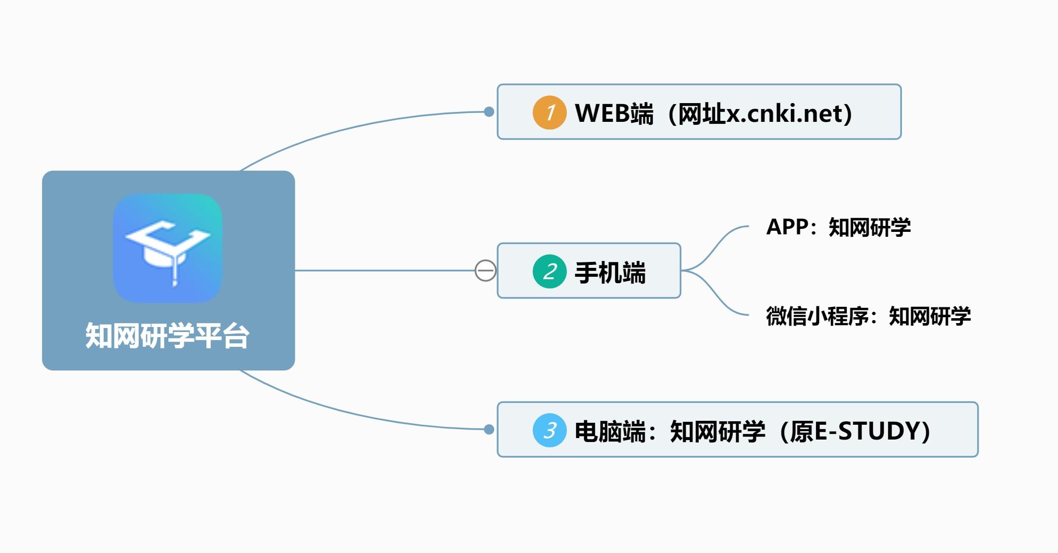 知网研学平台可进行三端服务,包括Web端(x.cnki.net)、PC端“知网研学”(原E-study)、手机端(APP、微信小程序“知网研学”)。