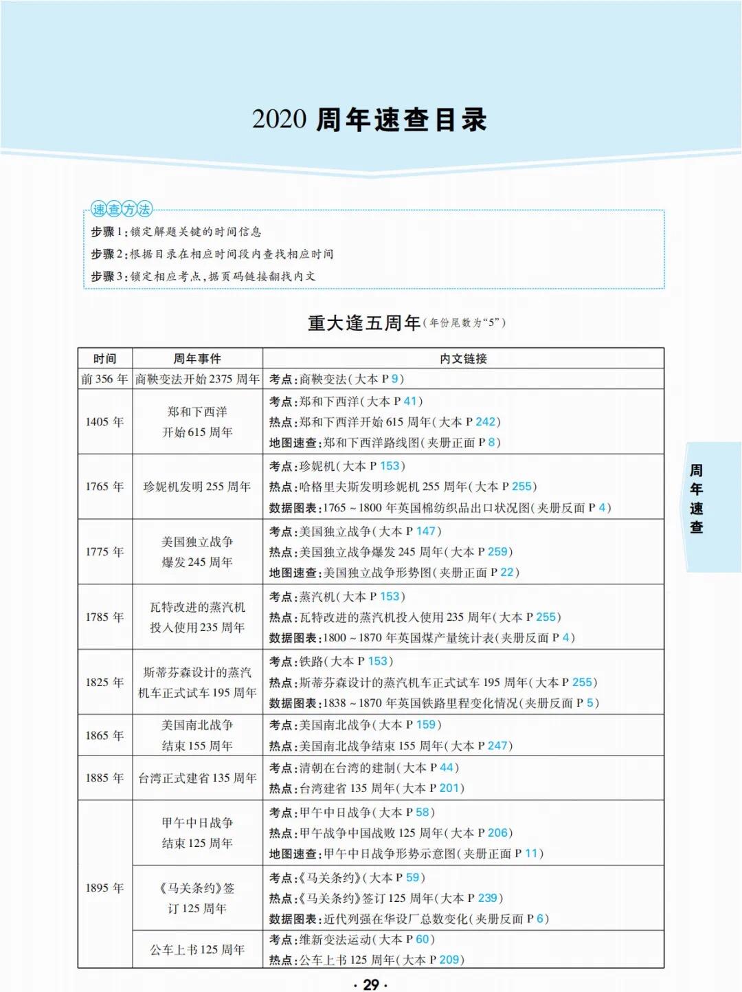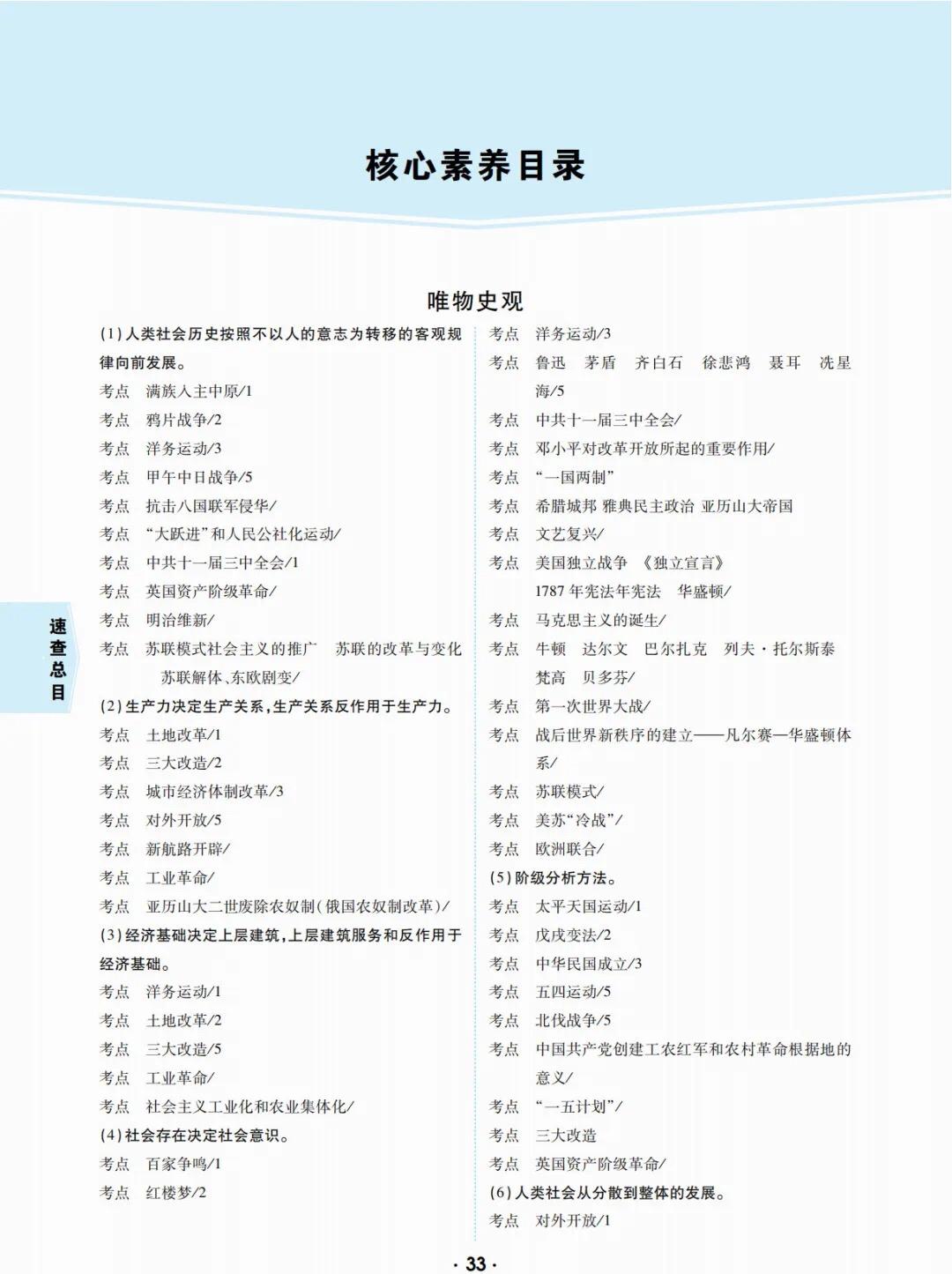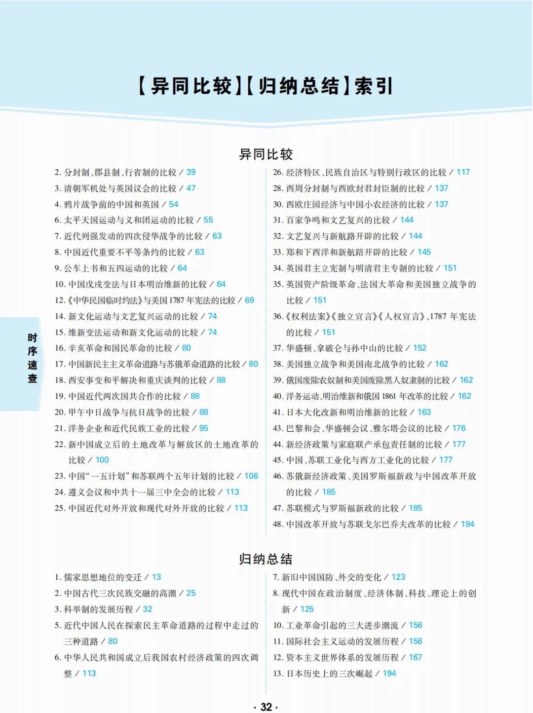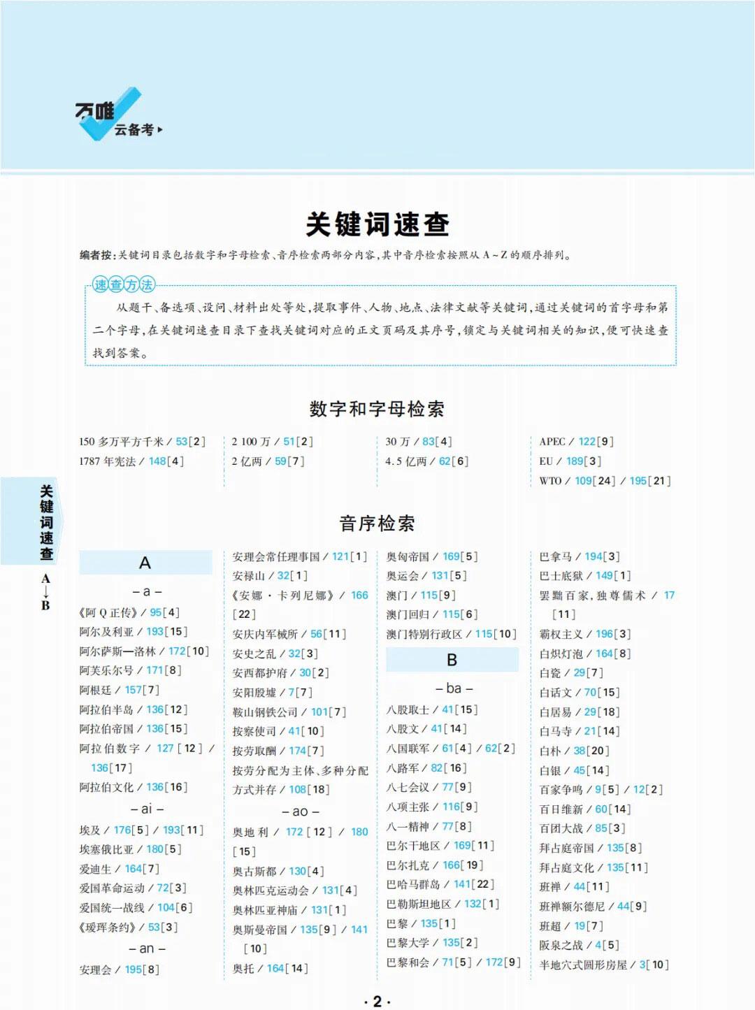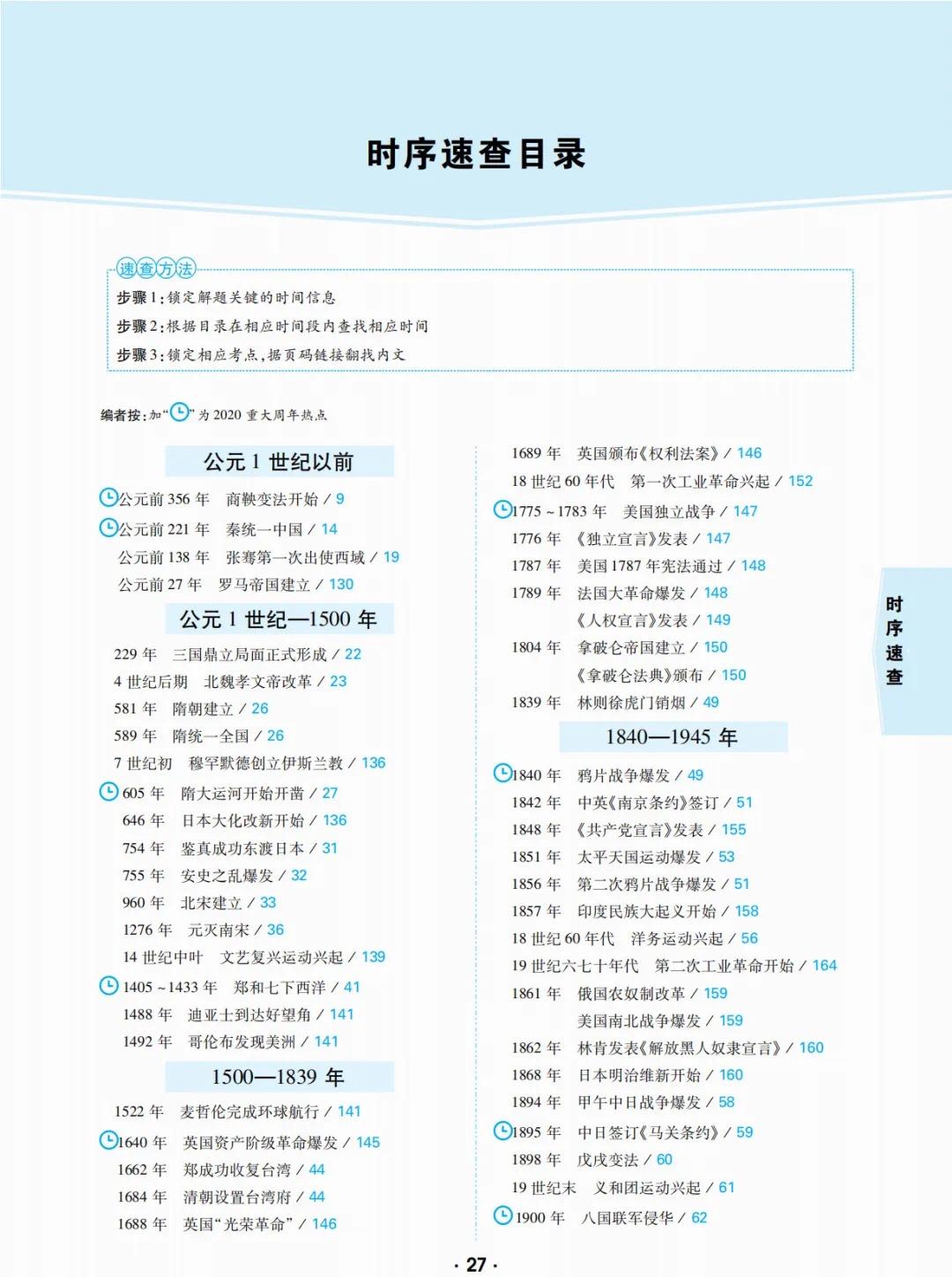 “关键词速查”针对内文中重要/高频知识点,提取关键词,并以“黑底反白”凸显,且目录处按照音序编排;另外,衍生出2020周年速查目录、【异同比较】【归纳总结】索引、时序速查目录、核心素养目录、最后一问速查目录,针对性更强,查找更精准。