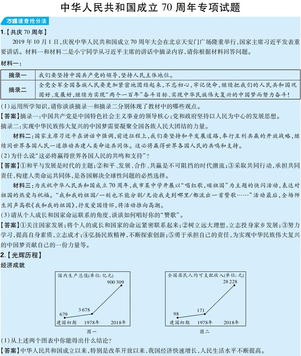 热点速查:重大热点(抗击新冠肺炎疫情、中华人民共和国成立70周年等)及地方常考热点素材下特配【专项试题速查】,以试题形式解读热点,将知识点、试题、热点三者有机结合。