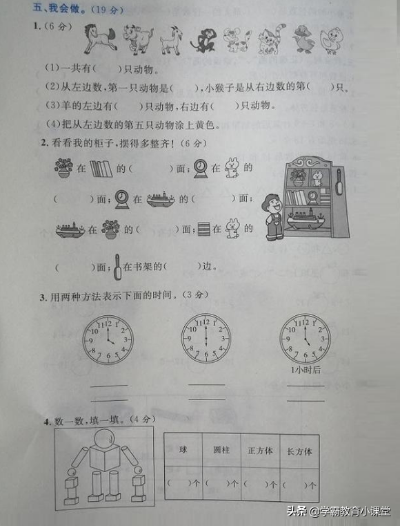 第五题:我会做。共有19分,这一题小同学想要拿满分可不容易哦。这题共有4个小题,考察的知识点比较多,包括上下左右知识点、时钟、认识图形等知识点。第2题主要考察上下左右,小同学一定要先看清楚左右两边的图形之后,再来答题,将每个图形的上下左右分清楚。