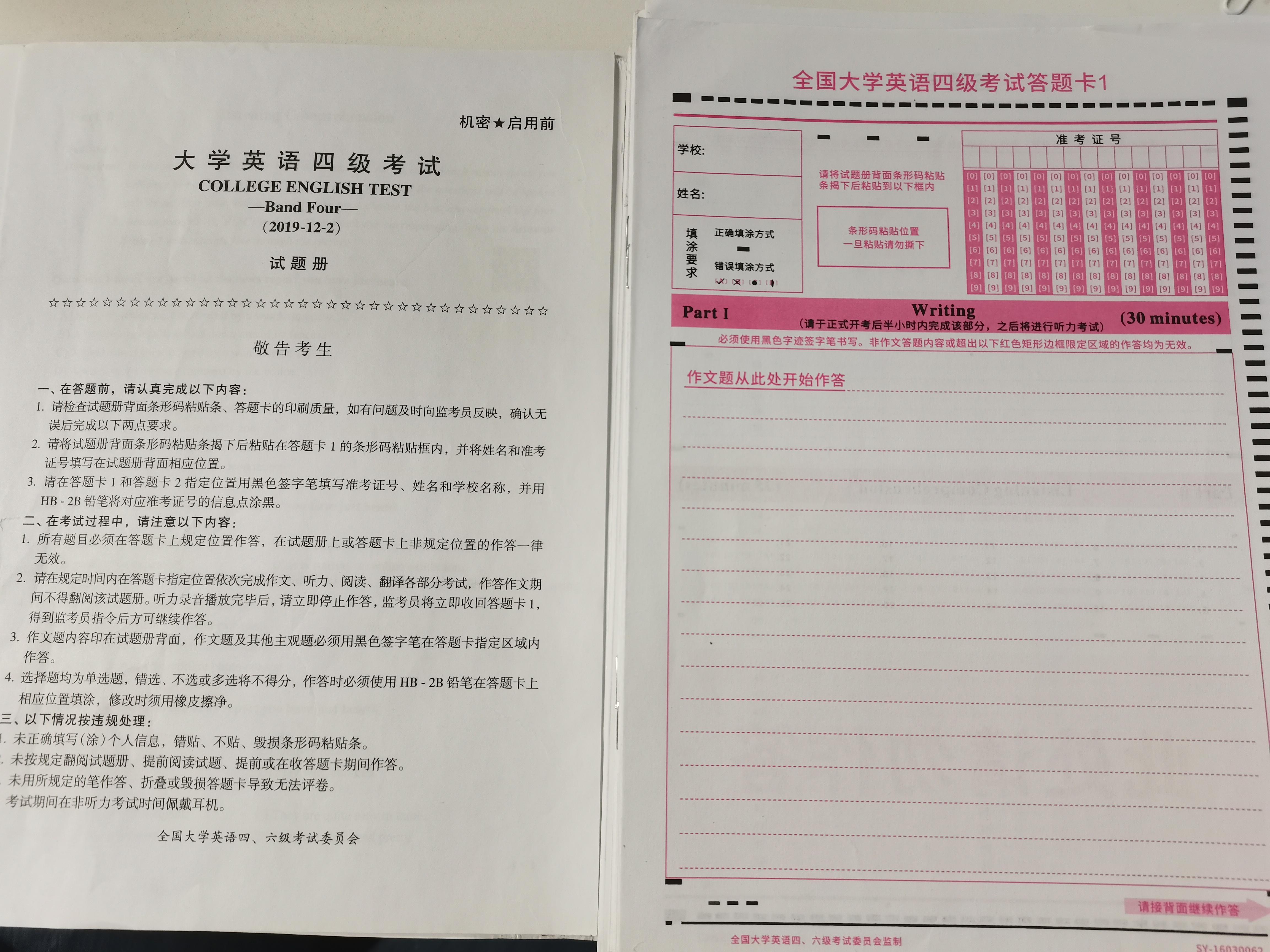 英语四级考试内容有哪些?如果你觉得第一个是听力,那你就大错特错了,在实际考试中,作文考试时间最早,为开考后的30分钟之内。很多学校甚至禁止考生在考作文的时间里翻看听力内容!