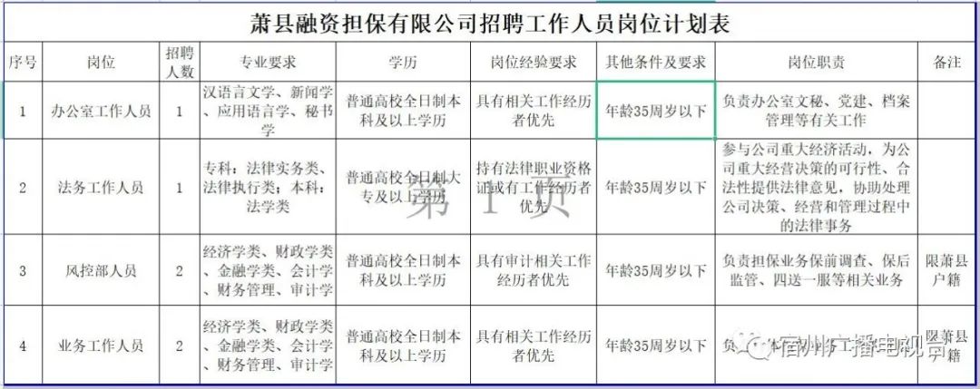 具体专业要求内容详见《萧县融资担保有限公司招聘工作人员岗位计划表》。