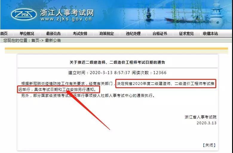 浙江人事考试网于3月13日发布《关于推迟二级建造师、二级造价工程师考试日期的通告》,决定浙江省2020年度二级建造师、二级造价工程师考试推迟举行,具体考试日期和工作安排另行通知。