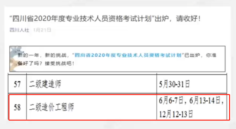 2020年1月21日,四川人社官方公众号发布了2020年度专业技术人员资格考试计划。其中第58条明确指出:四川省将在2020年举办三场二造考试!考试时间分别为:2020年6月6日-7日;2020年6月13日-14日;2020年12月12日-13日。
