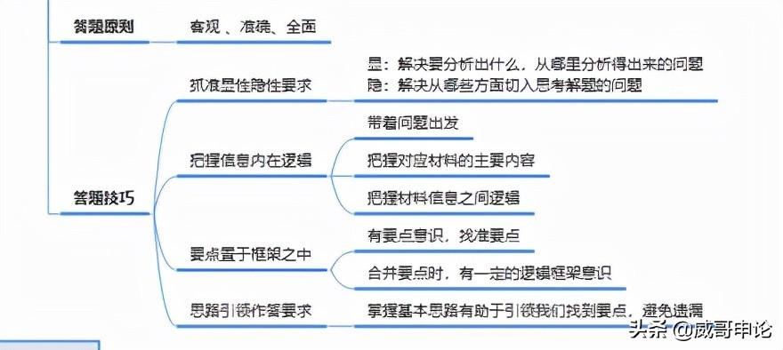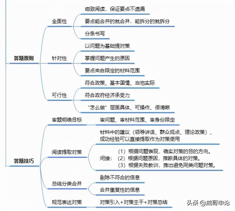 由于题型是按点计分,比如,这道题六分,那么这道题至少都有2-3个点,就不能轻易的去只看题目和材料中问的那个问题,更要去挖掘问题之下的本质,这里分享一下我自己做的答题技巧导图: