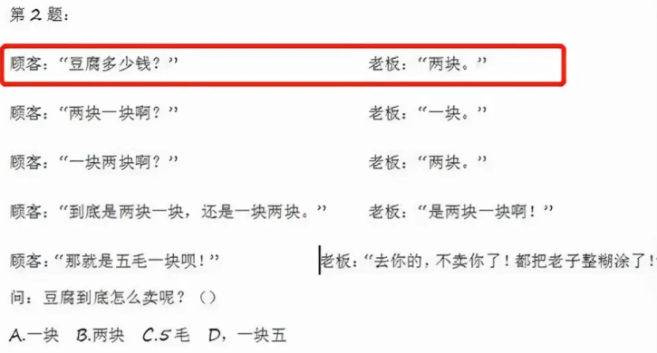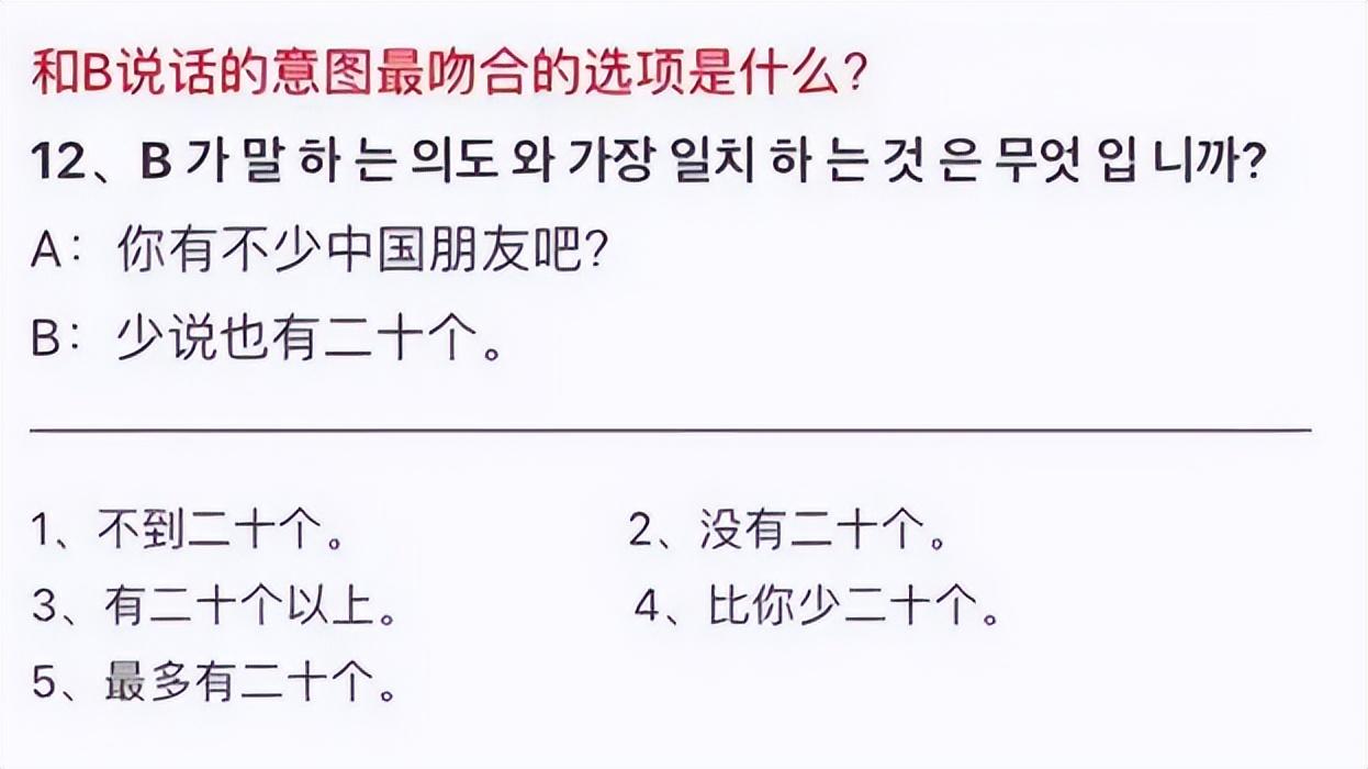 不信你看看下面这道题:A说你有不少中国朋友吧?B回答少说也有20个。问B有多少个朋友?这个答案其实很简单,还是选择题,可在韩国学生看来,就完全的蒙圈了。