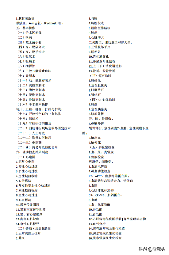 以下内容依照临床实际需求,分别从临床基础、内科穿刺术、外科无菌术、妇产科一般检查、急诊急救等方面列出。