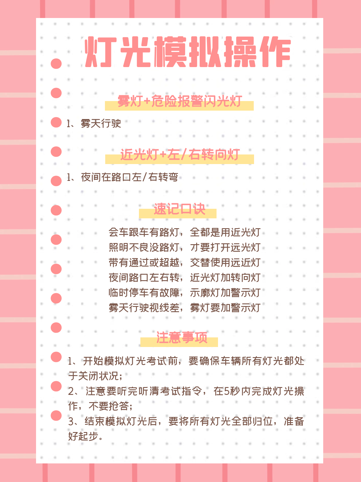 灯光模拟虽然简单,但也是科目三考试中很重要的项目,不少学员一不小心就挂科,想稳稳通过灯光操作,建议收藏这一份操作攻略!