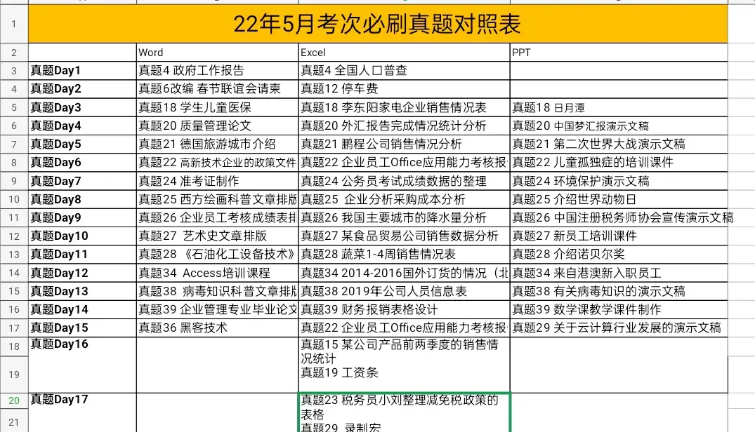 大概就是这些了,总之就是前期要强制刷考点,第一,可以巩固我们的基础知识,第二,没有成绩出来,不会戳伤我们的积极性哈哈哈!刷完考点就去做真题,真题如果实在做不完就去做必做的那些,我也会把图片发上来,一定要记住全部做完,而且一定要多做,反正word,ppt你做完考点之后做真题都是得心应手了,然后你做excel的话,我之前几个小伙伴的计算机二级打卡群一个伙伴,就是背公式,然后再找相应的题目做一下,也给他险过了!