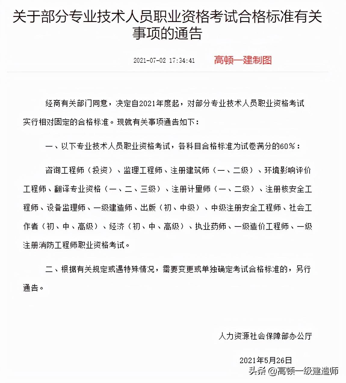 一级建造师考试多少分为合格分数线?早在2021年7月份,人事考试网就发布了《关于部分专业技术人员职业资格考试合格标准有关事项的公告》: