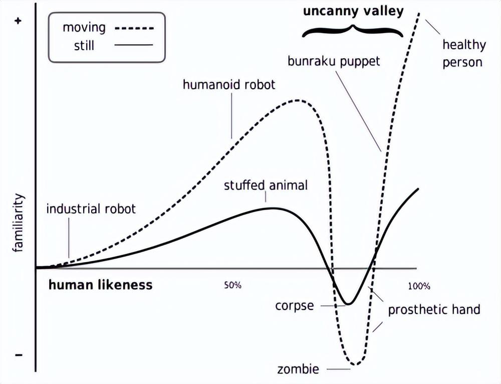这是日本机器人专家在1970年提出的假设,简单理解的话,就是指随着机器人的外表越来越像人,人们对机器人的情绪会变得越来越积极。但当与人类的相似度达到一定程度,人们的情绪就会转换成强烈的反感。不过如果在继续提升机器人的外观,达到与真人难以区分的程度,人们对机器人的态度就又会逆转,把对方当做真人。