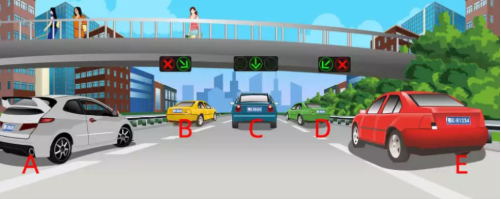 [69/100] 在图中所示有车道信号灯的路段,请判断哪辆机动车行驶的车道是正确的?
