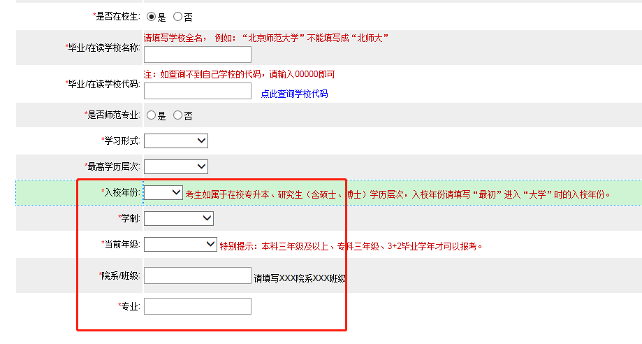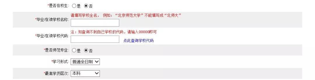 注意:学籍学号、最高学历证书编号请填写学信网中的学籍学号信息,并在“有无学信网学籍学号”信息项中选择“有”。