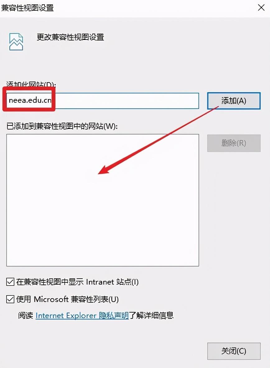第二步:将“neea.edu.cn”的域名添加至兼容性站点列表