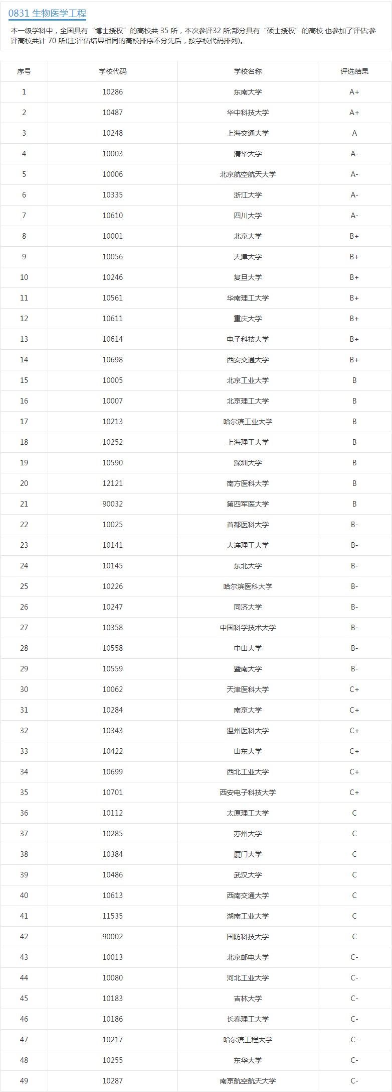生物医学工程、生物工程都很重要,以生物医学工程为例,在第四轮学科评估中,我们熟悉的工科强校排名都非常靠前。