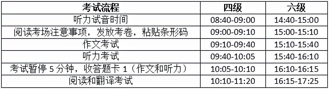 四级考试在上午进行,六级考试下午进行,具体时间安排如下: