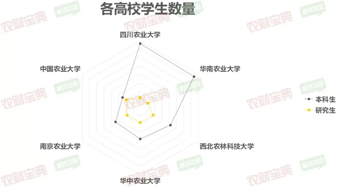 教授数量仍然是中国农大以接近700人的成绩遥遥领先,其余高校在380-480在范围内差距不大。教授数量可以一定程度上反映出教学质量,另一方面我们不妨看看在校学生数量。与教授数量排名不同,中国农大学生总数反而是最少的,其中研究生数量仍为最多,目前接近9700人,主要是本科生数量仅有1.2万人,远少于其他学校。四川农大和华南农大本科生数量接近4万人,而研究生数量则较其他学校要少。