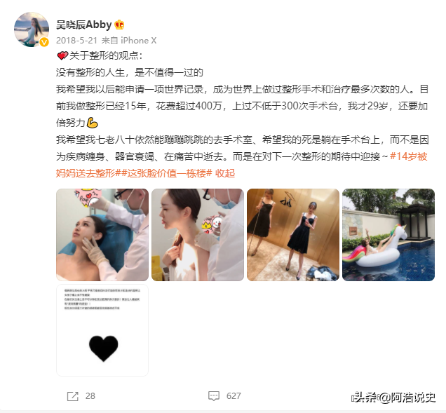 2018年,29岁的辽宁女子吴晓辰在社交媒体上发文表示自己在过去的15年里为了整形已经上了300多次手术台,花费也高达400万