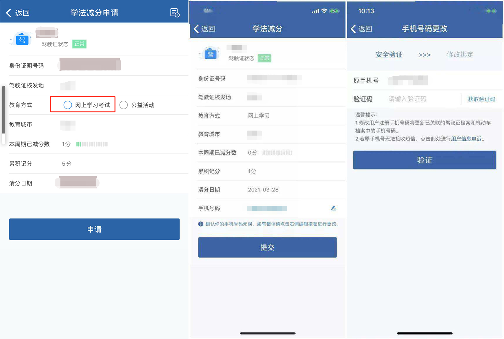3、进入“学法减分”页面,选择“网上学习”,然后点击“申请”,仔细阅读业务须知;然后仔细查看提交页面展示的信息,如果手机号码有误的话,可以跳转至修改手机号码页面进行修改,如果信息准确无误,那么点击“提交”按钮;