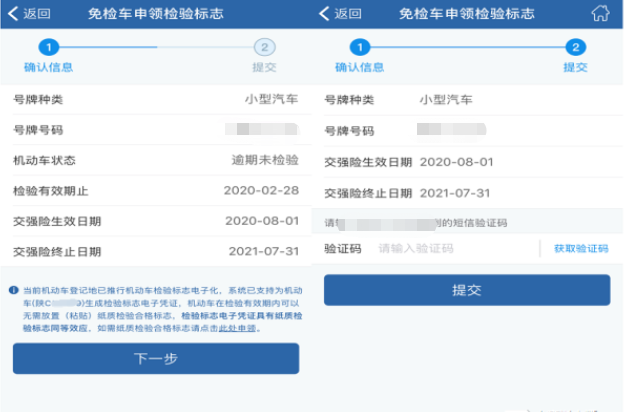 3、进入“免检车申领检验标志”详细信息页,认真核实相关信息之后,点击“下一步”,进入“提交”页面,再次核实内容无误之后,点击获取短信验证码之后,点击“提交”;