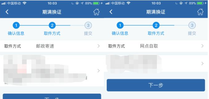 4、取件方式确认后,点击“下一步”,进入期满换证提交页面,再次确认所填资料信息无误,获取手机短信验证码,核实通过之后,点击“提交”按钮,完成期满换证业务申请信息的提交。提交成功之后,你可以通过“首页”——“网办进度”功能,实时查询业务办理进度。此外,对于选择自取的,需要自行前往自取服务网点,现场领取新驾驶证(也可以委托他人代领,需要提供本人有效证件和委托书);对于选择邮寄的,邮政快递会将新驾驶证快递到你所填的邮件地址处。自此,整个APP换证流程结束。