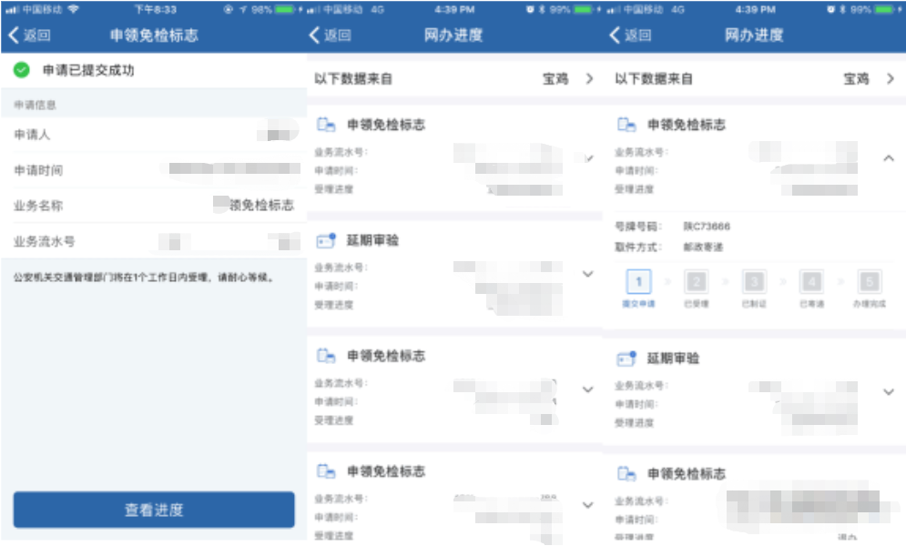 2、人脸识别通过之后,会提示申请已经提交,将会在一个工作日内收到APP推送的申领结果,或者可以通过点击下方的“查看进度”按钮,查看申领进度;