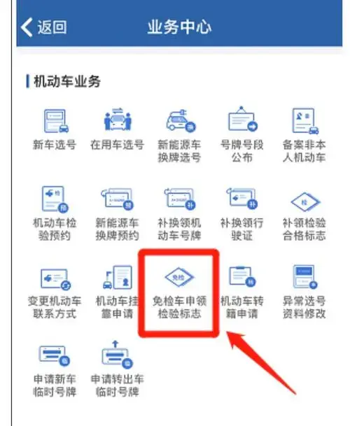 1、打开“交管12123”APP,首页选择“更多”,进入“业务中心”页面,找到“机动车业务”栏目,找到“免检车申领检验标志”选项,点击进入;
