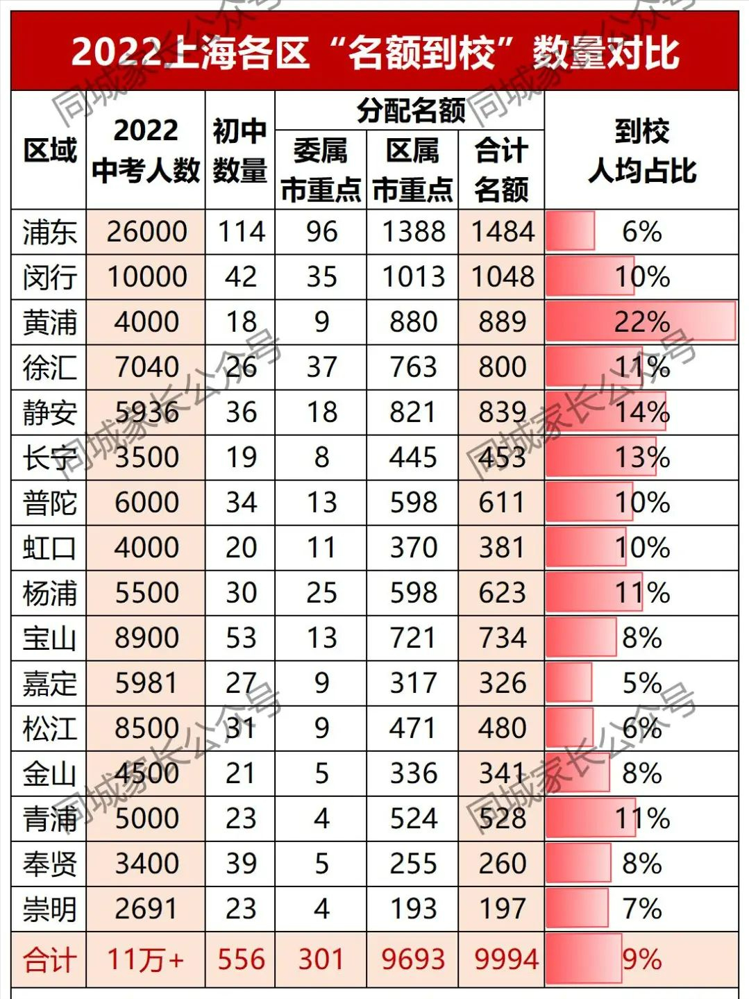 黄浦作为沪上的老牌教育大区、中考移民圣地,因为拥有8所市重点学校,加之区内人口基数较小,按照考生人数进行换算的话,黄浦名额到校占比最高,是货真价实的中考赢家。