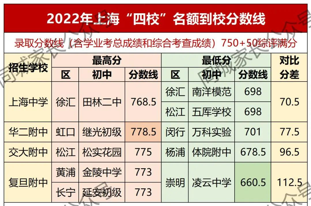 不含综评50分四校最低分数线排名1、复附:凌云中学(崇明,610.5分)2、交附:体院附中(杨浦,628.5分)3、上中:南洋模范(徐汇,648分)/五厍学校(松江,648分)4、华二:万科实验(闵行,651分)