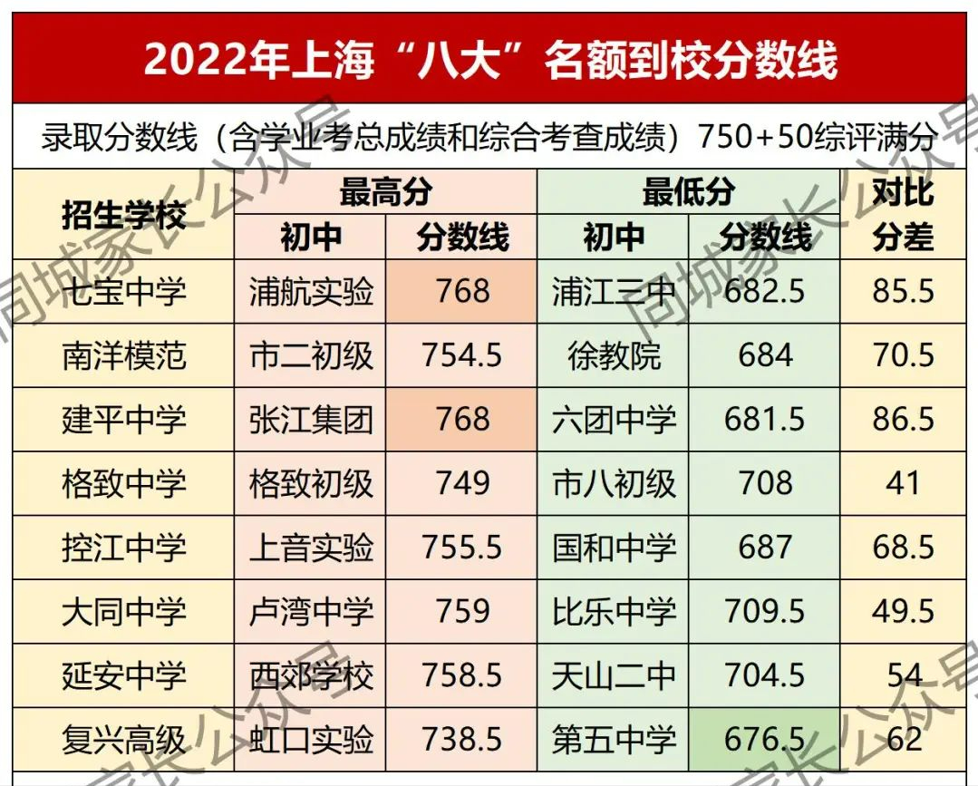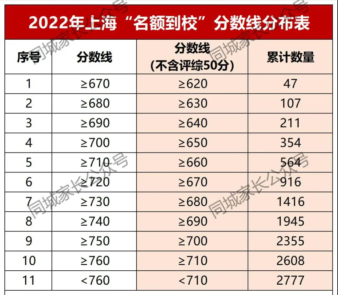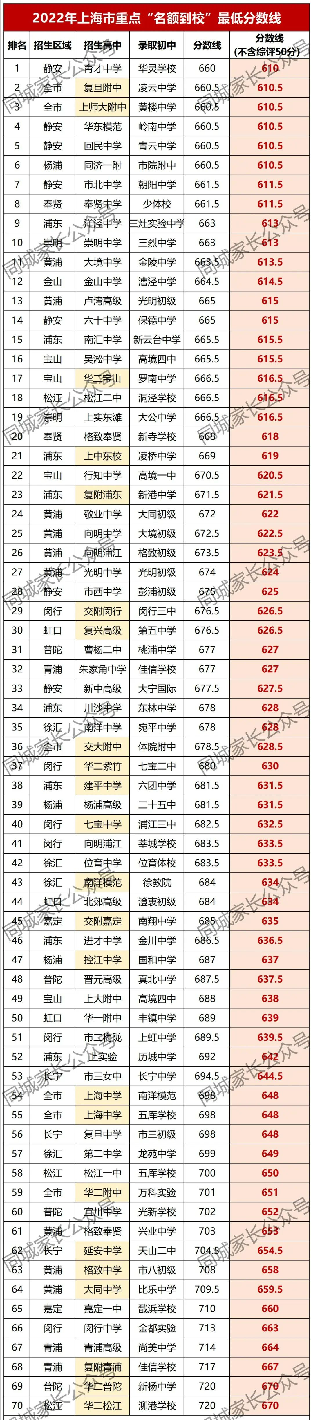 2022年,上海有70所市重点(含分校)进行“名额分配到校招生”,各高中学校的最低分数线,均不超过670分(不含综评50分)。