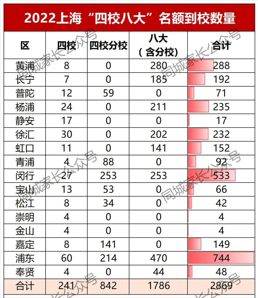 2022年,上海中考考生11万,全市有566所初中学校享有“名额分配到校”录取名额,合计到校名额共9994人,其中四校名额241人,四校分校名额842人,八大(含分校)名额1786人。