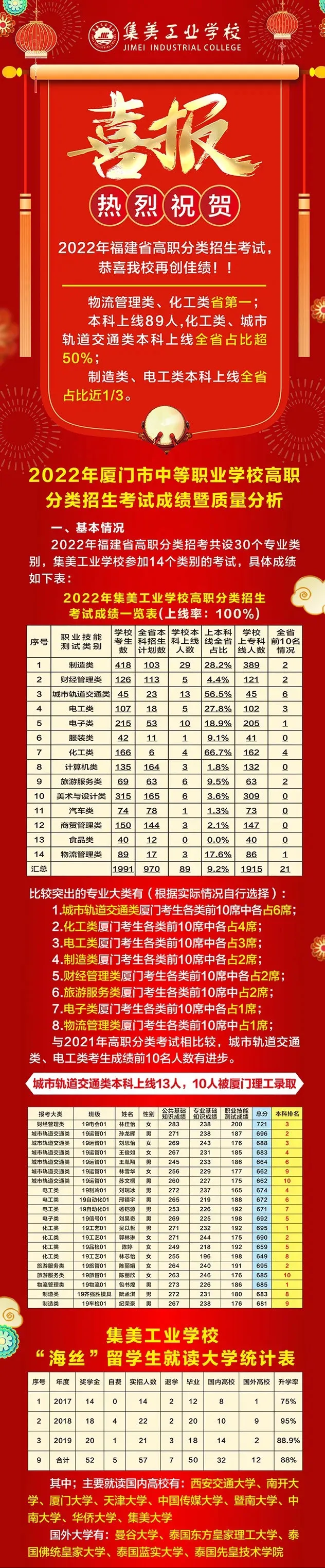 比较有名的包括:厦门工商旅游学校11个专业类考试,本科上线295人,占全省该11类本科计划数的29%、厦门信息学校本科上线人数99人、集美工业学校本科上线人数89人