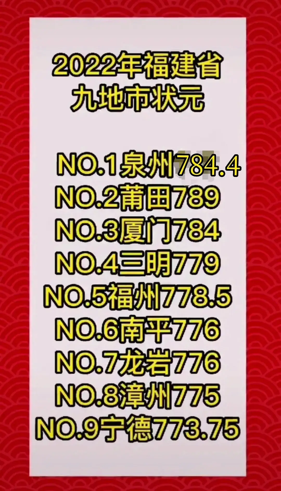 根据消息,2022年福建中考状元来自莆田,以789的高分夺得第一,其次分别是:泉州784.4分,厦门784分,三明779分,福州778.5分,南平776分,龙岩776分,漳州775分,宁德773.75分。